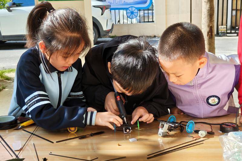 活动现场热闹非凡,各年级竞赛项目各具特色,紧扣科学原理,兼顾趣味性与实践性。一年级的纸杯叠高考验团队协作,二年级的离心力乒乓球接力趣味十足,三年级的用纸巧运水挑战结构创新,四年级的平衡鸟制作展现动手智慧,五年级的空气炮比赛兼具创意与实力,六年级的智造纸箱车竞速赛精彩纷呈。此外,铁丝陀螺、鸡蛋撞地球、航模飞行等自由竞赛项目,让不同年龄段的学生都能尽情发挥创意,在动手实践中解锁科学奥秘。