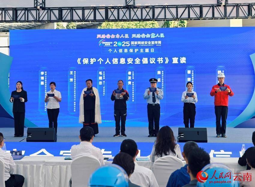 此次活动以“网络安全为人民,网络安全靠人民——以高水平安全守护高质量发展”为主题,全省8个边境州市及县区同步设立分会场。通过主会场大屏,现场与边境州市口岸、重点工程建设工地、民族地区进行实时视频连线,一线职工、外籍务工人员、少数民族同胞等在各自的岗位上,共同表达出守护网络安全、共筑清朗空间的决心与承诺。由全国劳模、新就业形态劳动者代表者发贵,云岭楷模毛建忠,昆明市反诈中心民警、妇女代表等7人共同宣读《保护个人信息安全倡议书》,呼吁社会关注个人信息安全。