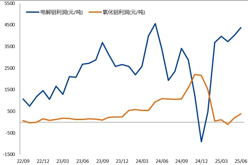 从必要性角度来看,氧化铝行业过剩格局明确,利润常年维持在盈亏平衡附近。由于氧化铝下游需求主要集中在电解铝,而电解铝行业在2017年就已明确产能天花板。若以单吨用量2吨进行测算,氧化铝需求上限为9000万吨左右。但目前国内氧化铝行业建成产能已达到11470万吨,且仍处于产能扩张期,2025年上半年新增产能980万吨,下半年预计仍有约400万吨的新增产能。从行业利润角度来看,虽然在2023-2024年利润出现大幅增长,但从中期来看,氧化铝行业利润始终处于盈亏平衡附近,铝产业链利润主要集中在电解铝行业。