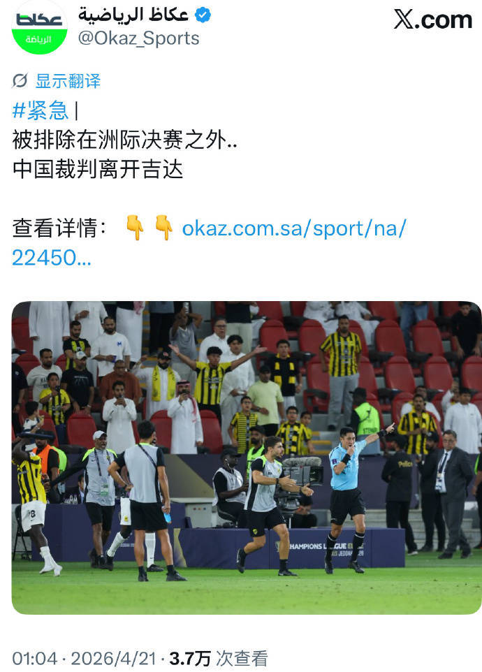 此外,马宁执法完当场比赛后,一直驻留在吉达赛区。而已经离开吉达赛区的另一位国际级裁判员是傅明,他的身份是VAR裁判员,而傅明本次赛事的执法工作也非常圆满。据了解,随着赛程推进,本赛季亚冠精英联赛场次不断递减,亚足联按惯例也会分批安排裁判员们离开赛区。如半决赛第2场比赛于北京时间22日凌晨结束后,亚足联将于次日安排另一批裁判员离开吉达赛区,而届时马宁才会明确是否继续留守。