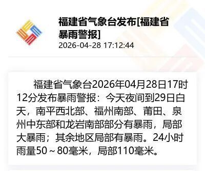28日,全省阴有阵雨或雷阵雨,内陆地区部分大雨到暴雨,沿海地区局部大雨。